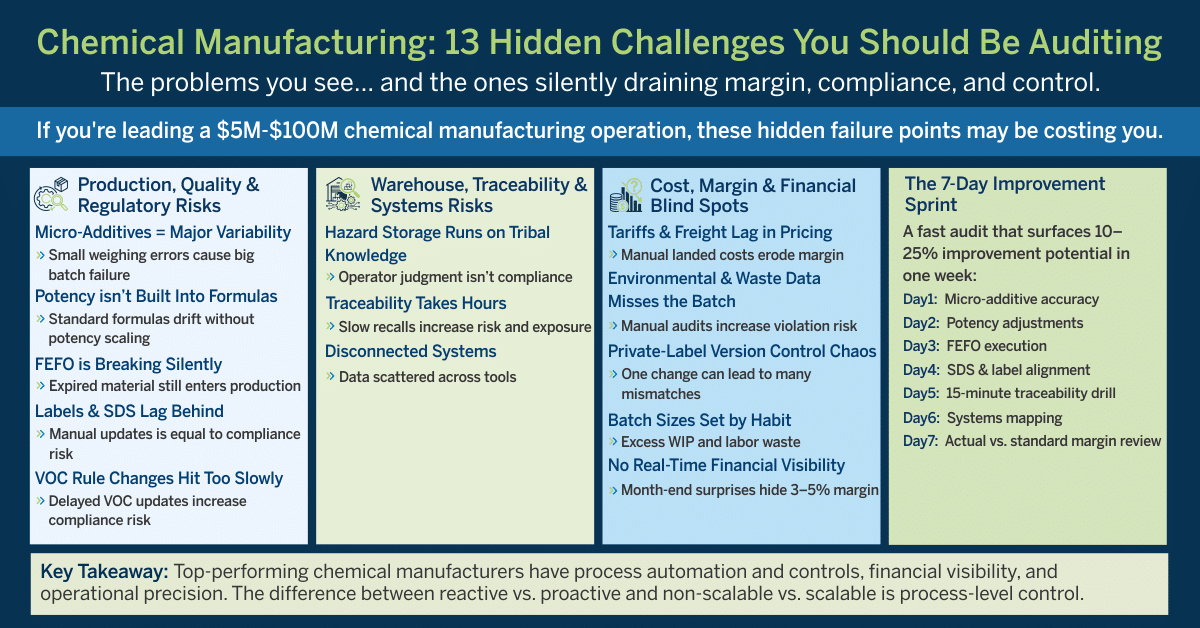 If you’re a CEO, COO, CFO, or Ops leader at a $5M–$100M chemical manufacturing organization, you probably already know the obvious challenges: