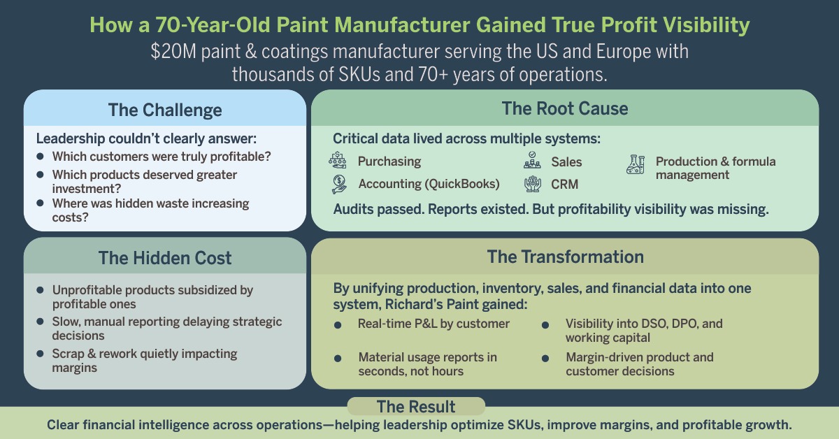 Richard’s Paint lived this reality for years. They had revenue data. They had cost data. But no way to connect them with the granularity needed to drive profitable decisions. They were compliant, operational, and strategically blind.
