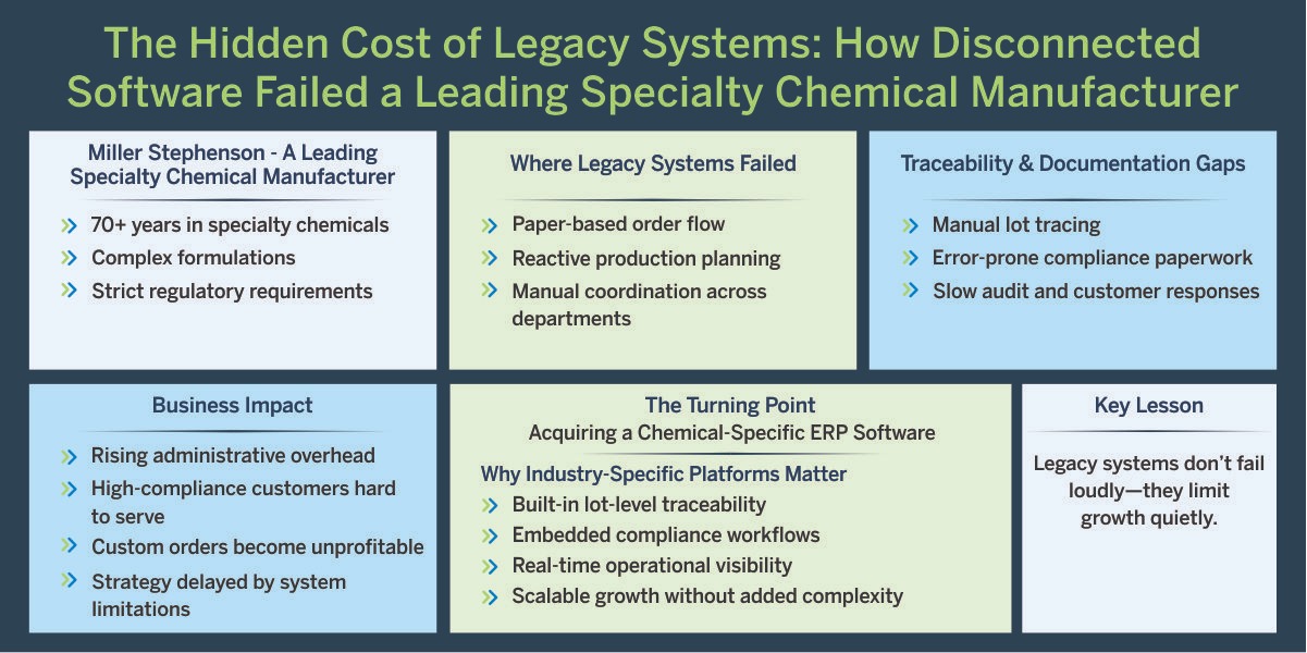 Miller Stephenson Chemical Company, a specialty chemical manufacturer with over 70 years of excellence, made a critical operational decision to replace its legacy, proprietary systems with an integrated platform specifically designed for specialty chemical manufacturing. This move was driven by the need for comprehensive operational visibility, embedded compliance capabilities, and a modern foundation to support continued growth in increasingly regulated markets.